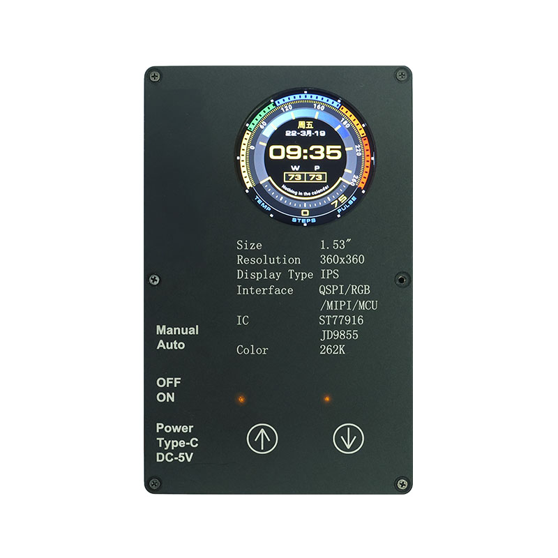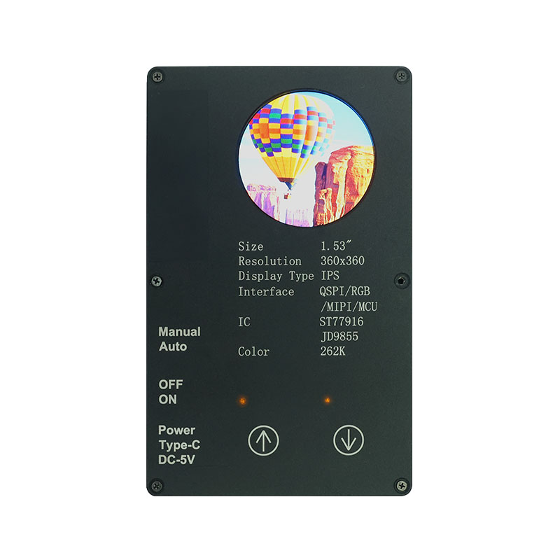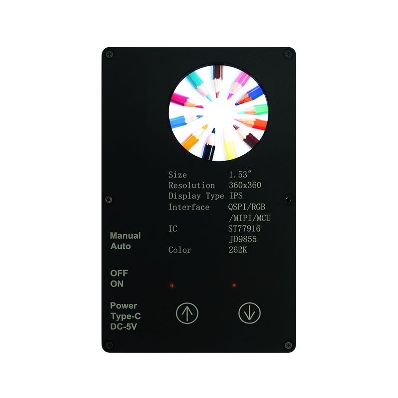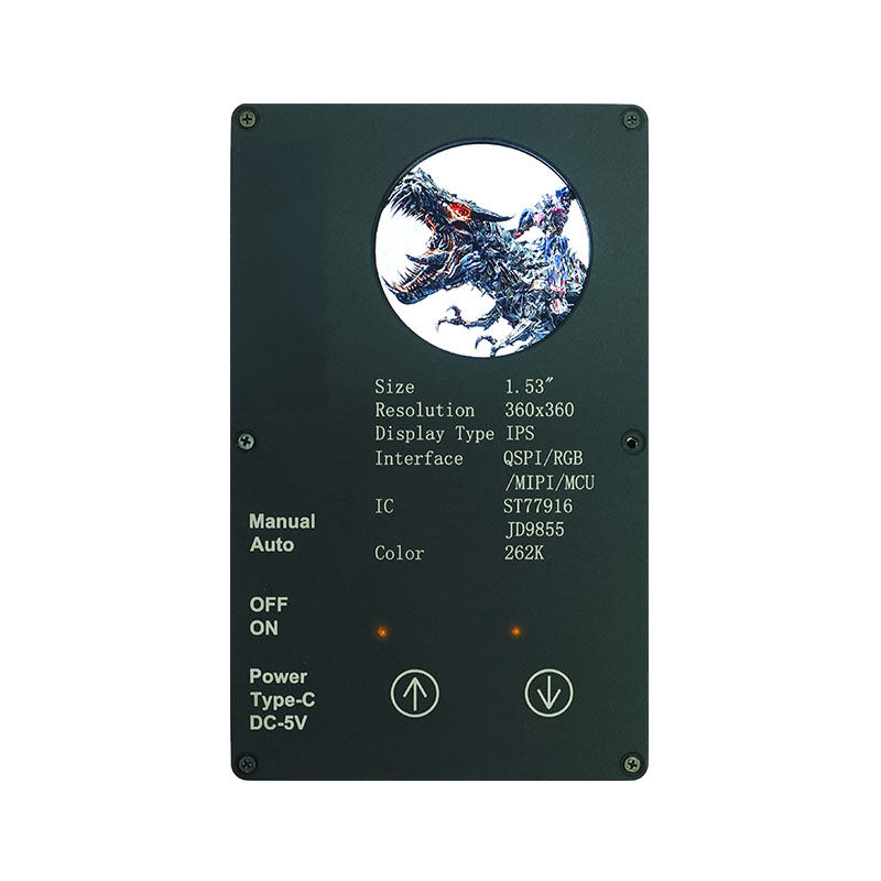 இந்த தனிப்பயன் காட்சி 360×360 உயர் தெளிவுத்திறன், அனைத்து பார்வை கோணங்கள் மற்றும் 400 cd/m² உயர் பிரகாசம் ஆகியவற்றைக் கொண்டுள்ளது. தொழில்துறை-தர இயக்க வெப்பநிலை வரம்புடன் (-20℃~70℃), இது மைட் அகற்றும் சாதனங்கள் மற்றும் ஜூஸர்கள் போன்ற ஸ்மார்ட் ஹோம் பயன்பாடுகளில் தெளிவான மற்றும் நிலையான செயல்திறனை உறுதி செய்கிறது. QSPI இடைமுகம் மற்றும் ST77916 டிரைவ் ஐசி ஆகியவை அதிவேக தரவு பரிமாற்றத்தை செயல்படுத்துகின்றன, அதே நேரத்தில் அதன் சிறிய தொகுதி அளவு (40.46×41.96×2.16 மிமீ) விண்வெளி செயல்திறனை அதிகரிக்கிறது.