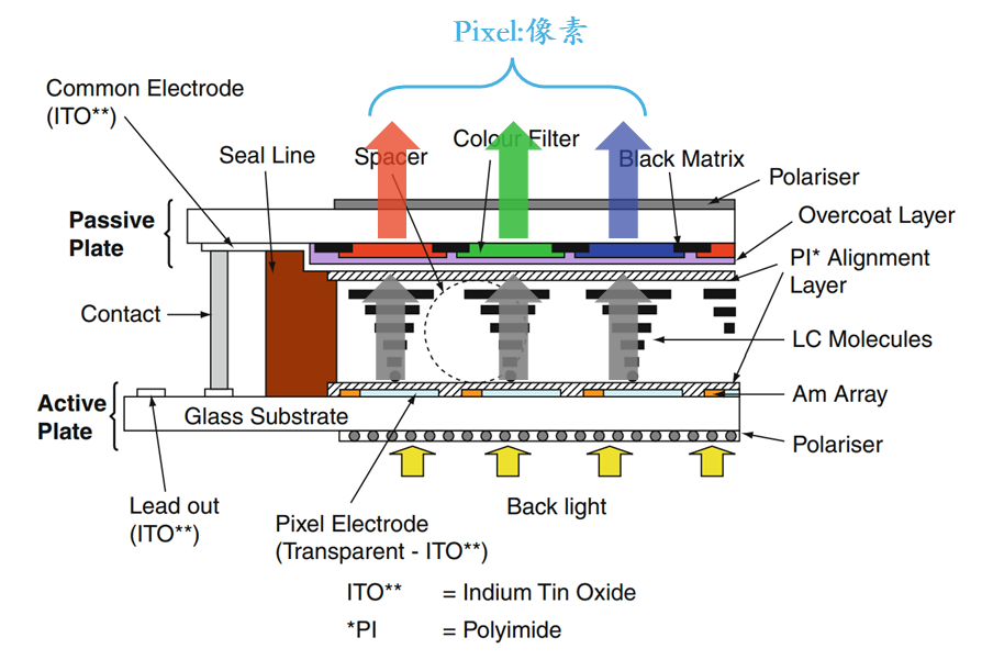 LCD (லிக்விட் கிரிஸ்டல் டிஸ்ப்ளே), மிகவும் முதிர்ந்த மற்றும் பரவலாக ஏற்றுக்கொள்ளப்பட்ட காட்சித் தீர்வாக, பின்வரும் அடிப்படைக் கொள்கையின்படி செயல்படுகிறது: ஒரு பின்னொளி அலகு வெள்ளை ஒளியை வெளியிடுகிறது, இது மூன்று முதன்மை வண்ணங்களை உருவாக்க RGB வண்ண வடிகட்டிகளை அடைவதற்கு முன்பு துருவமுனைப்பான்கள் மற்றும் திரவ படிக அடுக்கு வழியாக செல்கிறது. இறுதியாக, பயன்படுத்தப்பட்ட மின்னழுத்தம் வழியாக திரவ படிக மூலக்கூறுகளின் நோக்குநிலையைக் கட்டுப்படுத்துவதன் மூலம் ஒவ்வொரு பிக்சலின் பிரகாசமும் சரிசெய்யப்படுகிறது. பின்னொளி அலகு, TFT வரிசை, திரவ படிக அடுக்கு மற்றும் வண்ண வடிப்பான்கள்: இந்த செயல்முறை பல முக்கிய கூறுகளின் ஒருங்கிணைந்த வேலையைச் சார்ந்துள்ளது.