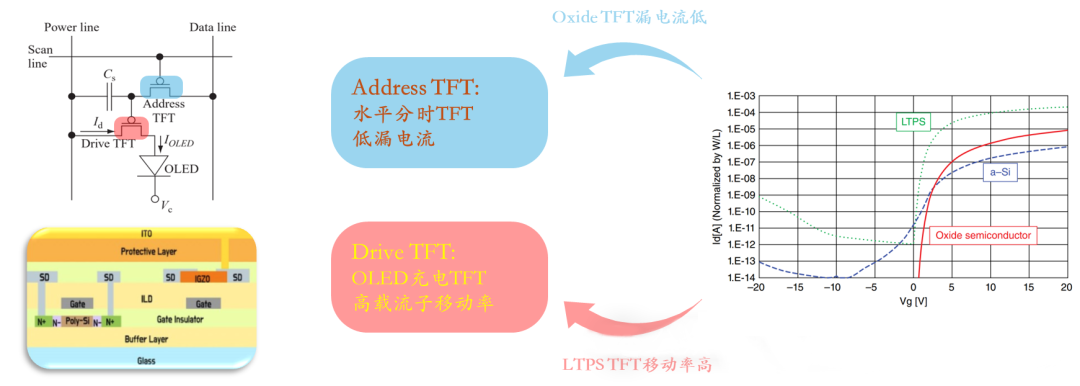 2018 ஆம் ஆண்டில் ஆப்பிளின் LTPO தொழில்நுட்பத்தை அறிமுகப்படுத்தியது, இவை இரண்டின் நன்மைகளையும் இணைத்து, LTPS மற்றும் IGZO TFTகளை ஒருங்கிணைத்து டைனமிக் ரெஃப்ரெஷ் ரேட் அட்ஜஸ்ட்மெண்ட்டை செயல்படுத்தி, திரை மின் நுகர்வை கணிசமாகக் குறைக்கிறது. இது உயர்நிலை AMOLED டிஸ்ப்ளேக்களுக்கான கையொப்ப தொழில்நுட்பமாக மாறியுள்ளது.