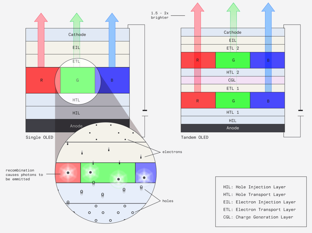 கூடுதலாக, மல்டி-லேயர் டேன்டெம் அமைப்பு, சார்ஜ் ஜெனரேஷன் லேயர் (சிஜிஎல்) வழியாக பல ஒளி-உமிழும் அலகுகளை அடுக்கி, சாதனத்தின் ஆயுளை நீட்டிக்கும் போது பிரகாசத்தை அதிகரிக்கிறது. இந்த தொழில்நுட்பங்கள் WOLED மற்றும் QD-OLED போன்ற முக்கிய வெகுஜன உற்பத்தி தீர்வுகளுக்கு மேலும் வழிவகுத்தன.