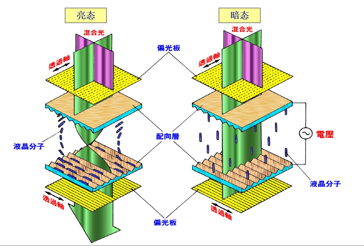 பிரகாசமான நிலையில் (காட்சி இல்லாத நிலை), திரவ படிக மூலக்கூறுகள் வழக்கமான 90 டிகிரி முறுக்கப்பட்ட அமைப்பைப் பராமரிக்கின்றன. முன் துருவமுனையின் பரிமாற்ற அச்சின் வழியாகச் சென்ற பிறகு நிகழ்வு ஒளி துருவப்படுத்தப்படுகிறது. இந்த துருவப்படுத்தப்பட்ட ஒளி திரவ படிக அடுக்கு வழியாக செல்லும்போது, அதன் துருவமுனைப்பு திசையானது மூலக்கூறு திருப்ப அமைப்புடன் 90 டிகிரி சுழல்கிறது, பின்புற துருவமுனைப்பின் ஒளியியல் அச்சுடன் சீரமைத்து பிரகாசமான நிலையை உருவாக்குகிறது.